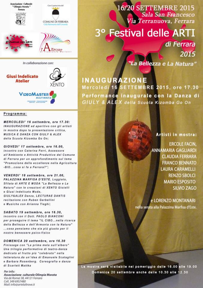 – LA NASCITA, A Ferrara il 16 settembre, in occasione del 3° FESTIVAL DELLE ARTI LA BELLEZZA E LA NATURA, a cura di Francesca Mariotti. Inaugurazione: Mercoledì 16 settembre 2015, alle ore 17:30, Sala San Francesco – 44121 Ferrara Locandina